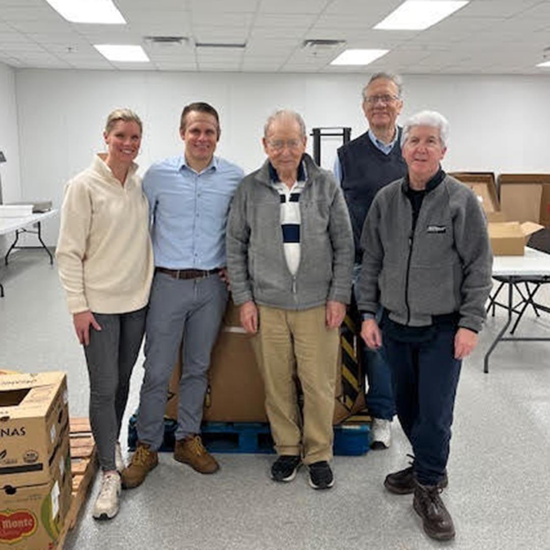 We put on hair nets and gloves to package two-pound bags of loose elbow noodles! Jerry Pelofske recommended an idea for efficiently scooping up the noodles into bags, weighing them, sealing the bags, and packing them up. It didn’t take too long, and we were humming, filling almost two large containers for distribution.