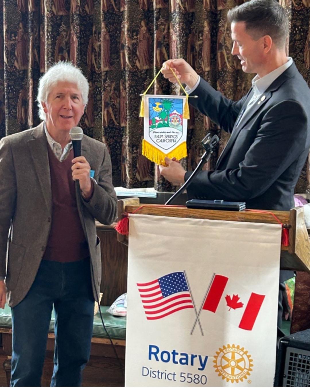 Jack Seiler presented a flag from another Rotary club to President Zach Walters.