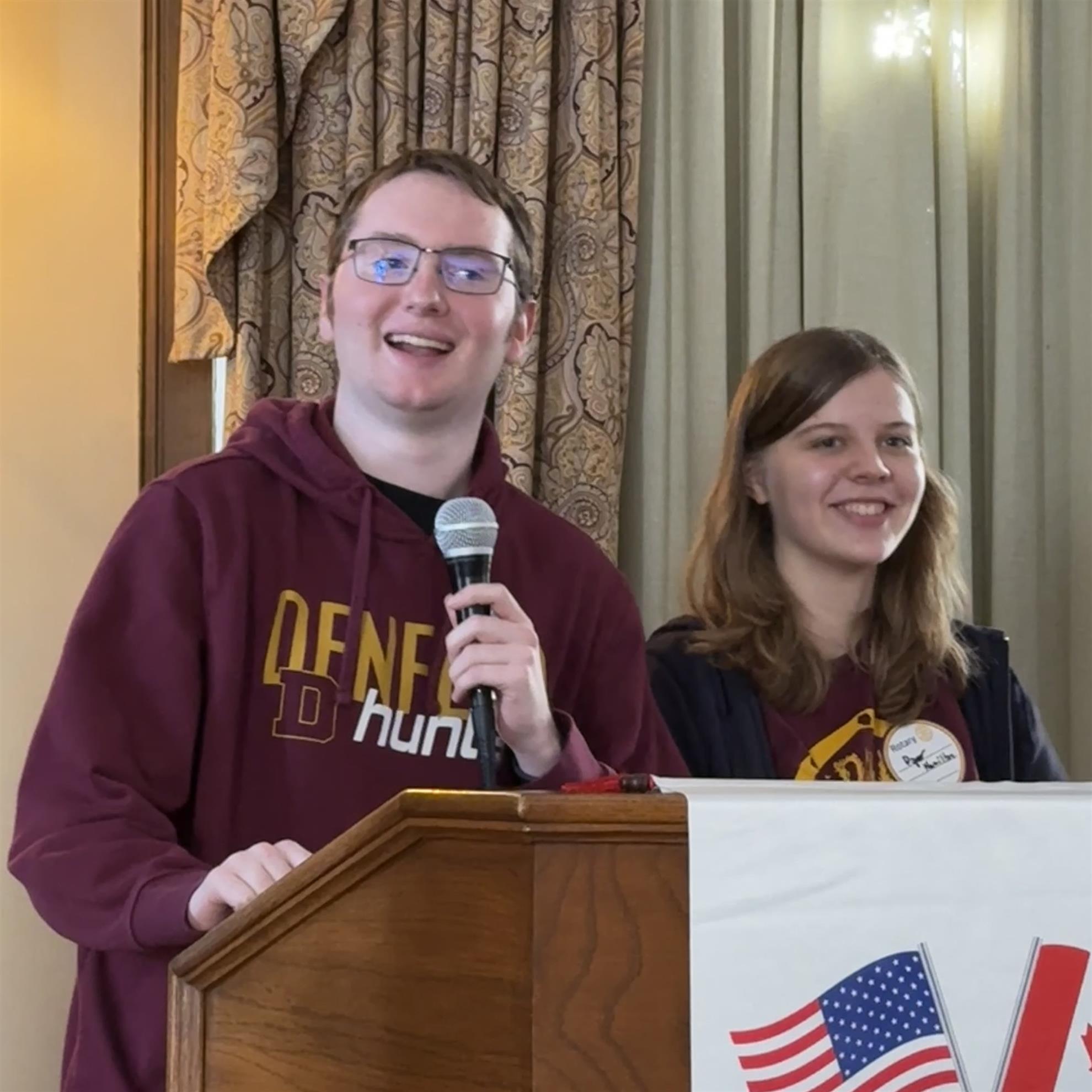 Chair of the Day, President Elect Dan Maki, introduced two Denfeld High School students who participate in the Denfeld Robotic team DNA4009 (Denfeld Nation Automation 4009). Piper Hamilton is the Team Captain, and Trevor Engstrom is the Business Captain. The first Robotic Team at Denfeld was organized in 1989, and now they have programs at three levels. The Lego League is for elementary students. Tech Challenge focuses on small robotics and is for grades 7-12. DNA4009 is a varsity-level FIRST Robotics Competition team with large robots.