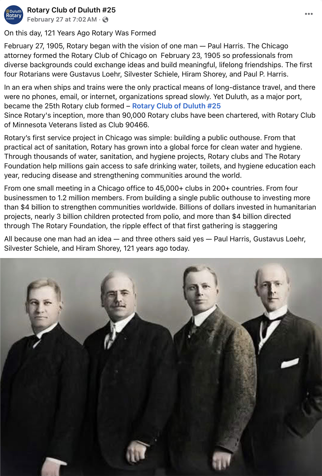 Friday, February 27, was Rotary's 121st Birthday! Below is the Facebook post from Club 25's page on Friday. Follow Club 25 on Facebook and Instagram @duluthrotary