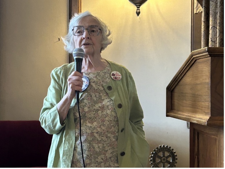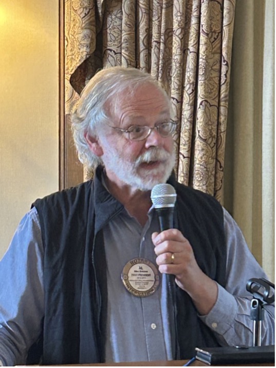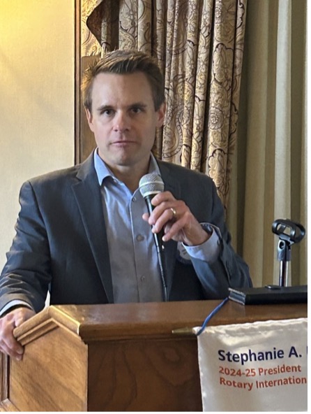 Self-reports give members a chance to share a milestone or event, have new members connect a name to a face, and raise money for the Golden Can in support of community grants. First up was Rob Hofmann with a “work-zone fine” as he announced the launch of a crowdfunding initiative in support of a new musical he is producing in Duluth. Jay Ott went a long way back, and had some fun, to connect the dots in order to drop money in the Golden Can. It seems today’s speaker many years ago was a cook at his restaurant. Geiger Yount shared a recent story about her “I Sell Rotary Roses” button and having a person ask: “Do you sell peaches too?” The person did buy a dozen roses while explaining she was once a Junior Rotarian and attended RYLA. You never know how your past efforts influence today.