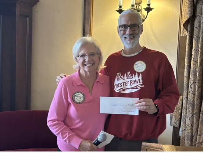 Grants Committee Chair, Chana Stocke, had two of the five recipients ready to receive a Club Community Grant. For the fall cycle, the committee had $10,000 to distribute, with another $10,000 to be distributed next spring. The number of submittals for consideration far outstrips the available funds. The first grant of $2,000 was to Chester Bowl for their Ski School Scholarship Fund. Dave Schaeffer described the programs at Chester Bowl, the number of youth served, and how the grant helps make skiing affordable. The second grant of $3,000 was awarded to the Damiano Center for their Kids Kitchen Program.