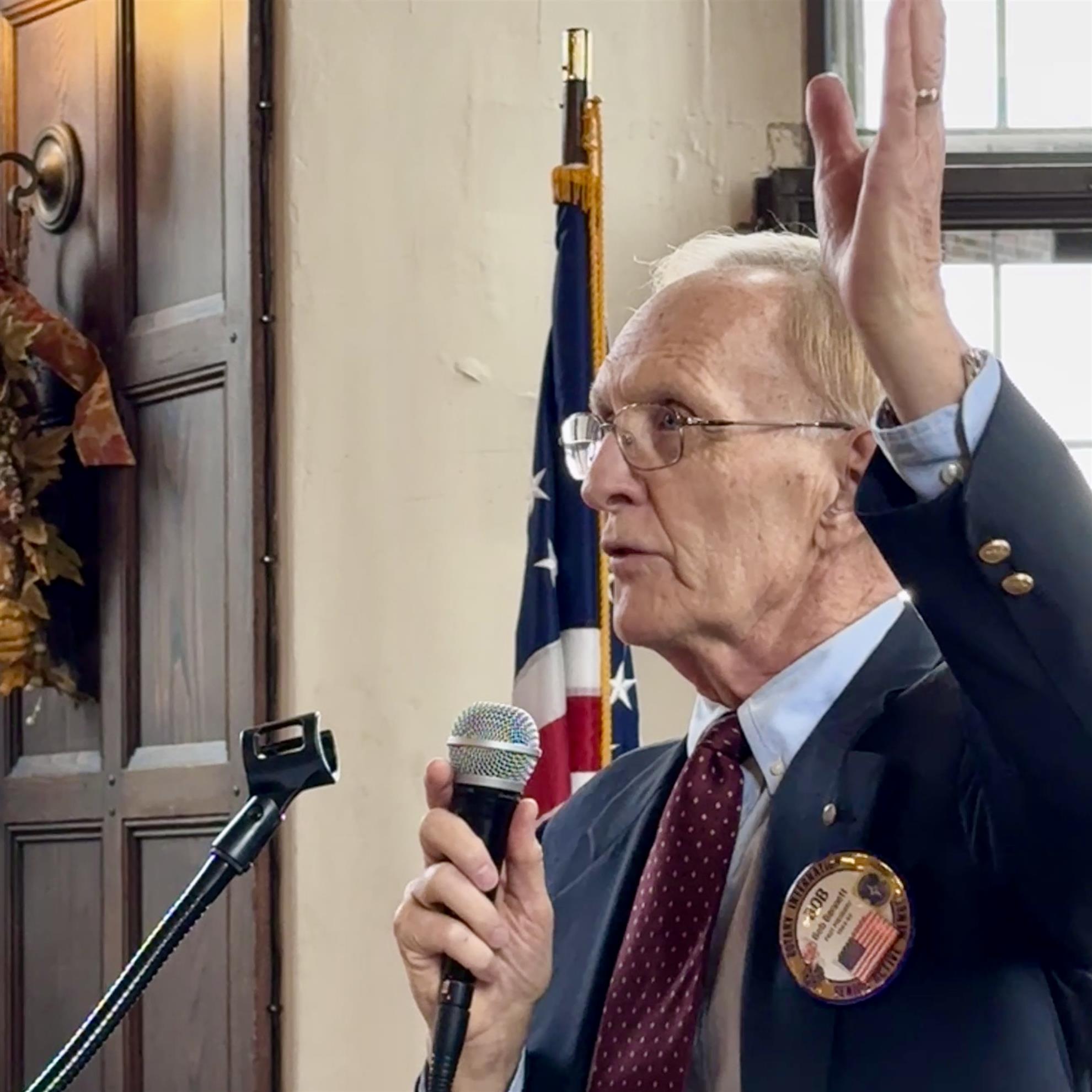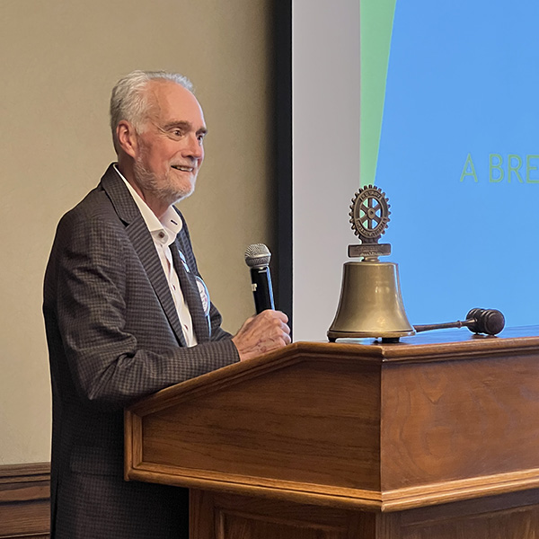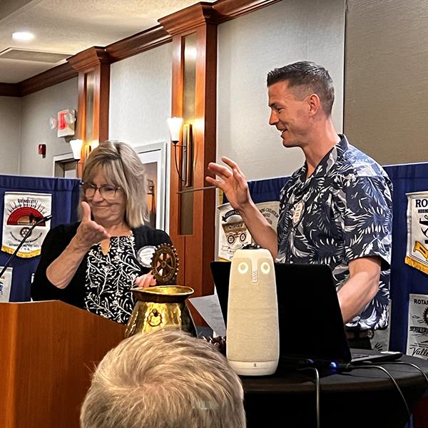 With a ring of the Rotary bell President Zach Walters gained the attention of Rotarians and guests for our weekly meeting with the theme of honoring our Veterans. Appropriately, he asked all to stand to recite the “Pledge of Allegiance” and “Four Way Test”.