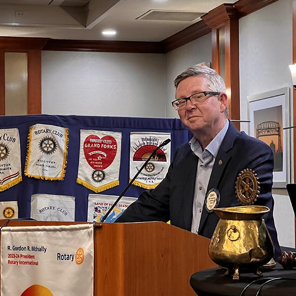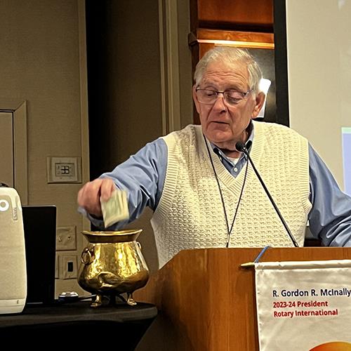 The Reflection for the Day was brought by Past-President Al Makynen who had attended the Rotary International Convention in Bangkok in 2012. It was there that he heard a presentation on Rotary's Area of Focus – Peace and Conflict Resolution – and the work of Peace Scholars. The convention speaker described the desperate situation in a huge refugee camp that was out of control. No countries or organizations were allowed to mediate between the factions except for Rotary International. It was then that Al realized that Rotary was something much bigger than he ever imagined. Hopefully, someday with the assistance of Rotary Peace Scholars, we no longer use the words: Conflict, Police Action, Civil War or World War.