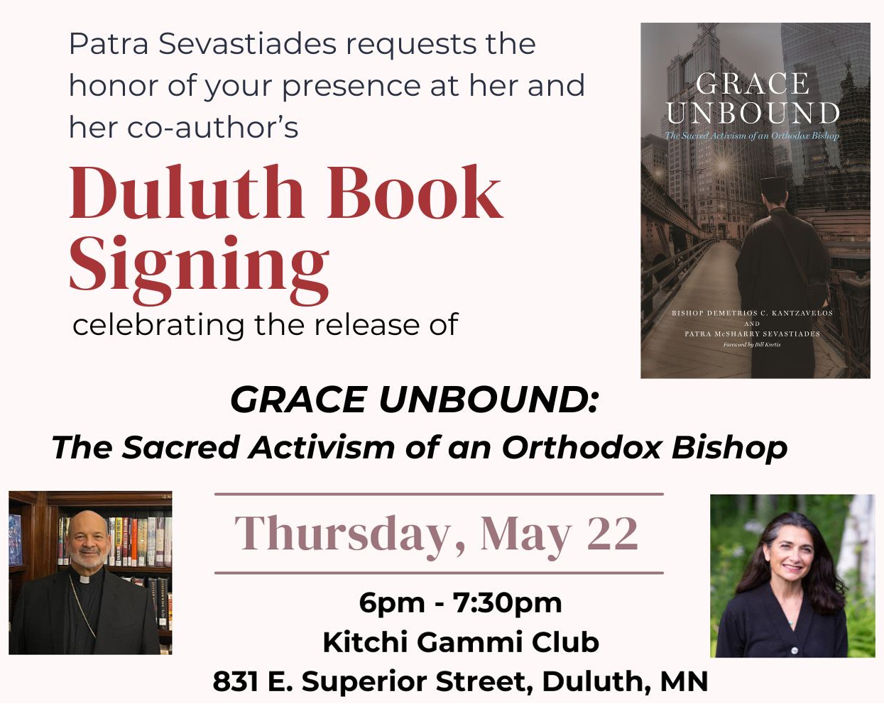 No less proud was our very own recently published author, Patra Sevastiades of her book “Grace Unbound: The Sacred Activism of an Orthodox Bishop.” Even better there will be a book reading and signing event on Thursday, May 22 at 6:00 p.m. at the Kitchi Gammi Club. A short reading with thoughtful questions and answers to follow, including refreshments.